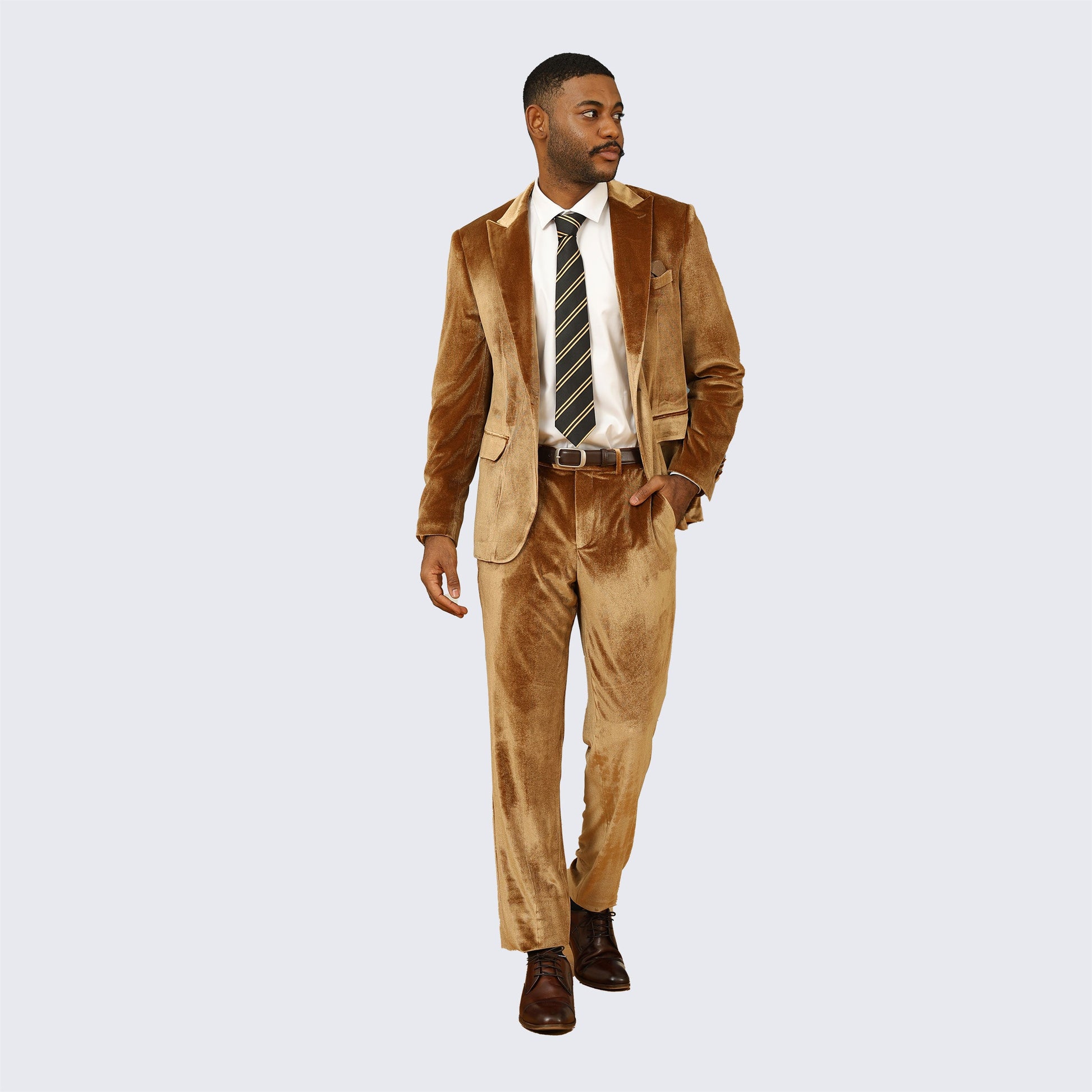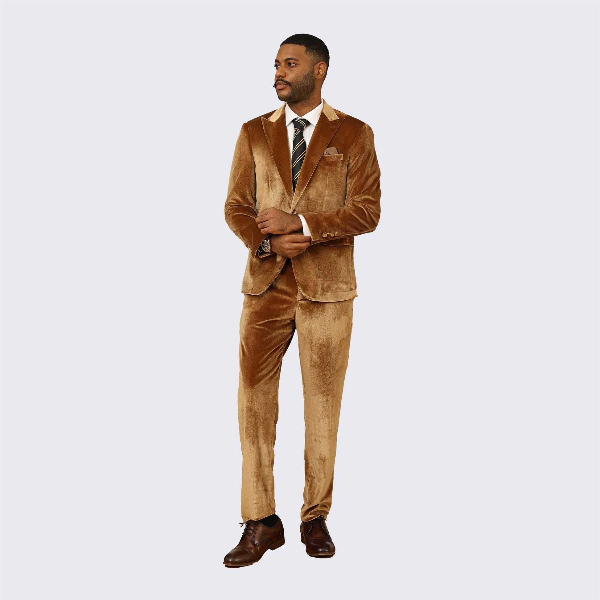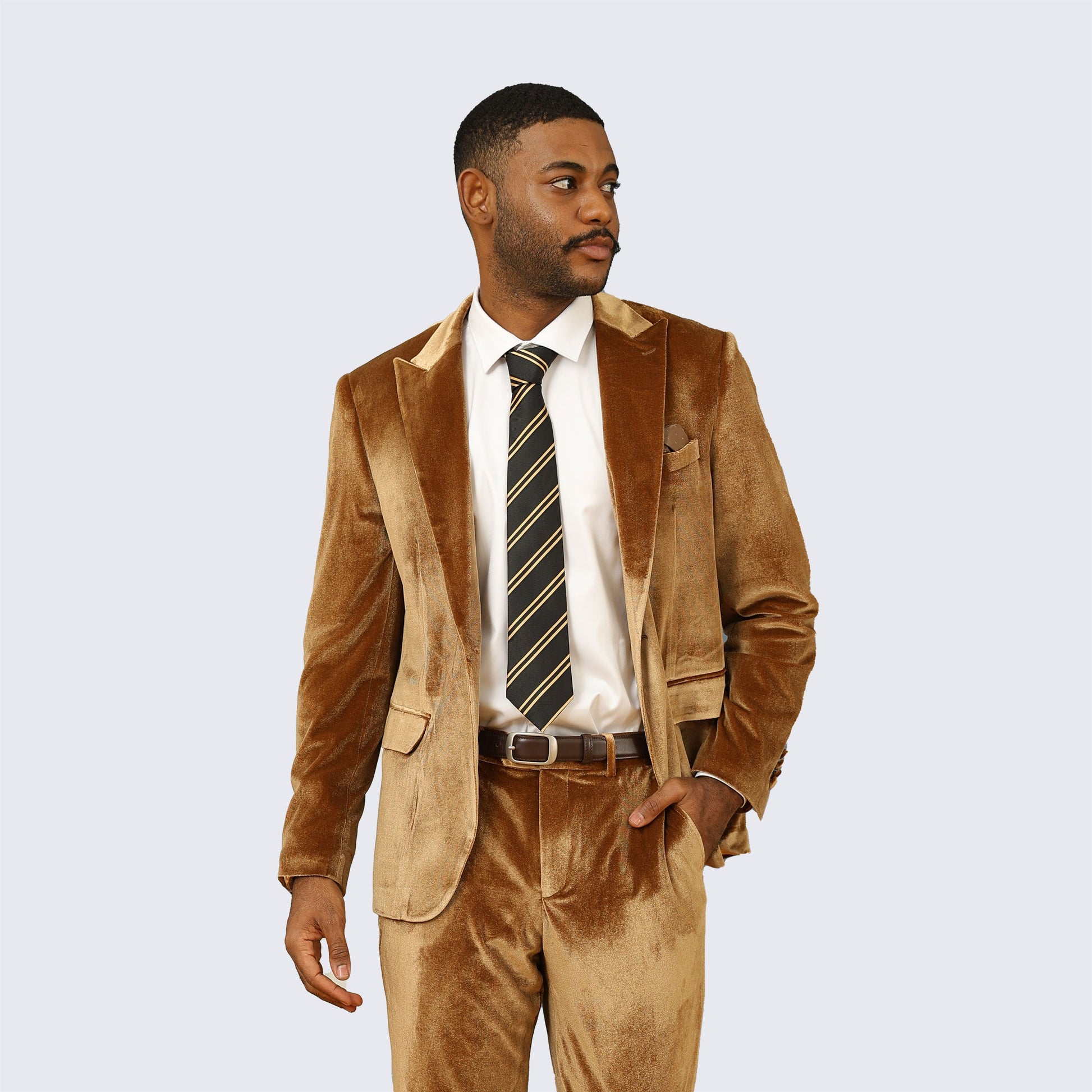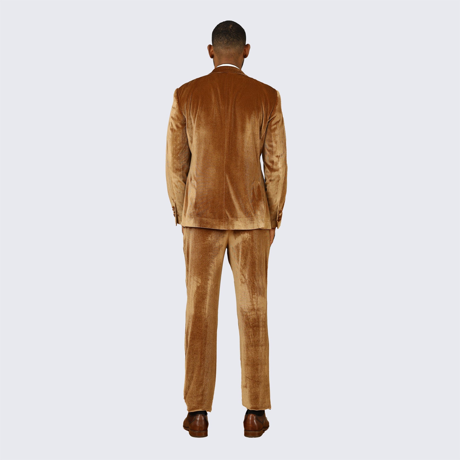 Men's golden brown ,velvet tuxuedo. Skinny fit two piece set with peak lapel. Coat has one button front closure . Jacket has two front flap pockets and one chest pocket. Jacket pockets are usable but come sewn shut. Gently cut open to use. Tetron silk lining. Very high quality and well constructed. Comes with plain-front tapered trousers with narrow leg opening. Pants are a six-inch drop. Subtract six inches from your jacket size to determine your pant waist size. Meaning, if the coat size is a 40R the pants waist will be a 34R. Pants are lined to the knee. Pants come unfinished at the bottom so that you can hem at your proper length. This suit is ideal for weddings, proms, and other formal events. Dry clean only. Please note, this is a skinny fit suit. It has a tighter cut, especially in the pants. If you are in between sizes, we suggests you go with the larger size.